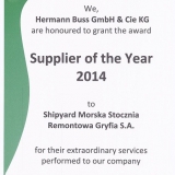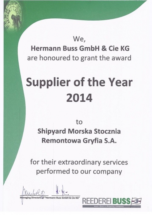 Morska Stocznia Remontowa Gryfia w Świnoujściu została uhonorowana tytułem "Dostawca Roku 2014" przez operatora Reederei Hermann Buss GmbH & Cie KG z Dolnej Saksonii. Certyfikat ma potwierdzać niezawodność, wysokie kompetencje i poziom w zakresie komunikacji i obsługi kontrahentów armatora.
