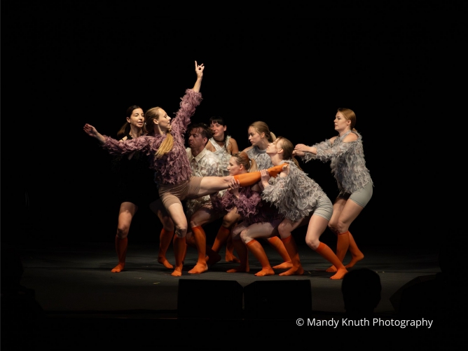 W drugiej części wieczoru przestrzeń teatru Chapeau Rouge w Heringsdorfie wypełniła się ruchem, dźwiękiem i emocjami, które przeniosły widzów do świata ptaków, pozornie różnego, a jednak podobnego do świata ludzi. Ptaki, podobnie jak ludzie podróżują, współpracują, rywalizują, szukają swojej “drugiej połówki”, smucą się i wspierają siebie nawzajem. Niezwykle ważna dla nich jest wolność, która “uskrzydla” i daje radość z życia.