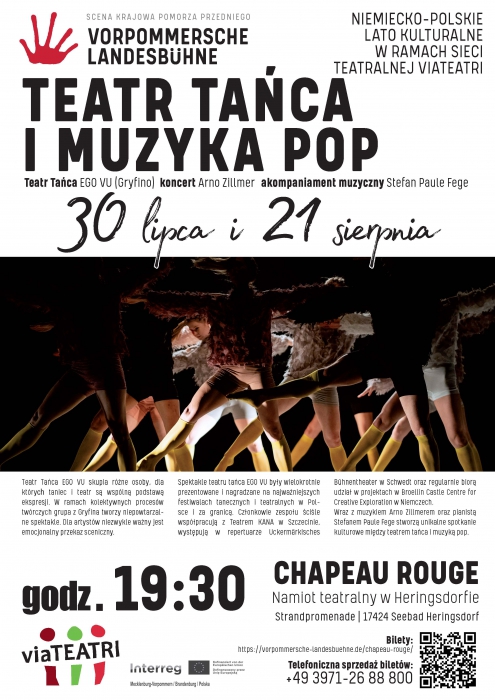Tych, którzy nie mieli okazji tam być zapraszamy na powtórny występ Teatru Tańca EGO VU i Arno Zillmera w najbliższy czwartek. 21.08.2025 o godzinie 19:30 w namiocie teatralnym Chapeau Rouge przy promenadzie w Heringsdorfie. Bilety w cenie 15 Euro można kupić w kasie teatru lub online: vorpommersche-landesbuehne.de/chapeau-rouge/.