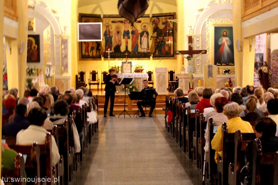 Wykonali też „Recitativi” na akordeon i altówkę Krzysztofa NAKLICKIEGO - świnoujskiego akordeonisty, pedagoga i kompozytora - utwór specjalnie dla nich na ten koncert napisany. Kompozycja niezwykle trudna technicznie, wirtuozowska. To był łańcuch recytatywów, przeplatanych, niczym refren ronda, kupletami. Skala i możliwości techniczne obu instrumentów i wykonawców, wykorzystane bez ograniczeń, zagrane po mistrzowsku przez obu muzyków. Charakter i stylistyka poszczególnych ogniw utworu nawiązuje do różnorodnej stylistyki, począwszy od barokowego „fugato”, przez efekty sonorystyczne, typowe dla muzyki impresjonistycznej, aż do stylu „musette” charakterystycznego dla akordeonowej muzyki rozrywkowej. Ileż tu zmian rytmu, melodii, wirtuozerii, a wszystko w doskonałej harmonii obu instrumentów. Premiera tego utworu zagrana fenomenalnie. Owacyjne brawa trwały i trwały, ale też młodzi wirtuozi zasłużyli na tę owację, bo zagrali celująco.