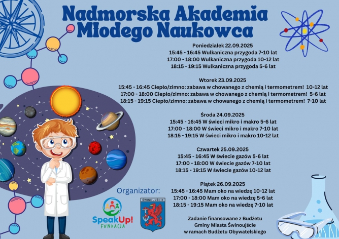 We wrześniu Świnoujście zamieni się w centrum naukowych odkryć dla najmłodszych. W dniach od 22 do 26 wrześniaodbędzie się Nadmorska Akademia Młodego Naukowca – seria bezpłatnych warsztatów, które mają na celu popularyzację nauki poprzez zabawę i praktyczne eksperymenty. Projekt, finansowany z Budżetu Gminy Miasto Świnoujście w ramach Budżetu Obywatelskiego, skierowany jest do dzieci w wieku od 5 do 12 lat.