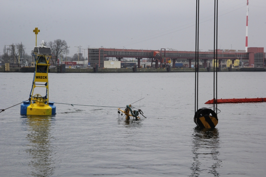 Zatopiony „Kuguar” należący do szczecińskiego Zakładu Usług Żeglugowych waży ok. 170 ton ale wrak wypełniony wodą i mułem to znacznie większy ciężar. W sam raz dla takiego siłacza jak potężny dźwig „Maja”, który przypłynął ze Szczecina i może unieść do 330 ton.