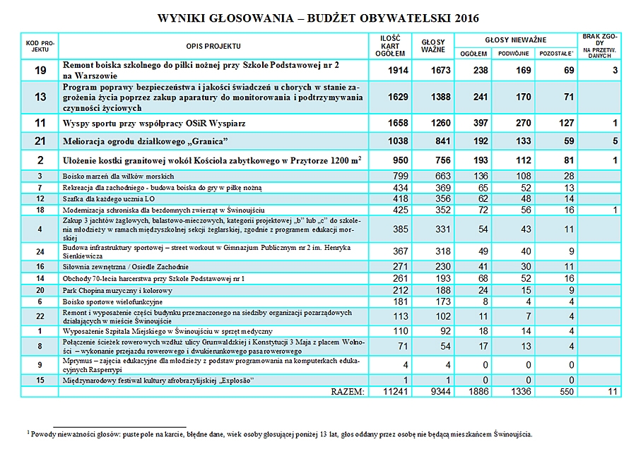 Tegoroczna edycja pokazała, że siła tkwi w małych i zwartych społecznościach. Poza pierwszym miejscem, które uzyskało 1673 ważne głosy (1914 łącznie), kolejne pozycje to zakup aparatury do monitorowania i podtrzymywania życia dla miejskiego szpitala z 1388 głosami (1629), Wyspy sportu przy OSiR Wyspiarz – 1260 (1658), melioracja ogrodu działkowego „Granica” - 841 (1038) i ułożenie kostki granitowej wokół zabytkowego kościoła w Przytorze – 756 (950).
