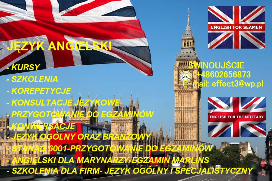 JĘZYK ANGIELSKI DLA MARYNARZY I PRACOWNIKÓW ŻEGLUGI: • Wszystkie poziomy zaawansowania, • Materiały do nauki wliczone w cenę zajęć. • Testy sprawdzające poziom zaawansowania. • Język dostosowany do potrzeb słuchacza dla wszystkich stanowisk. • Zajęcia indywidualne. • Słownictwo ogólne, techniczne oraz morskie. • Dni i godziny zajęć do uzgodnienia. • Zajęcia weekendowe, • Tłumaczenie i wypełnianie aplikacji morskich. • Konsultacje językowe. • Praktyczna nauka języka, • Przygotowanie do testów i egzaminów morskich (MARLINS, MARLINS-TOSE) • Możliwość przeprowadzenia testów na miejscu. • Konwersacje. • Zajęcia ONLINE na platformie SKYPE. • Kontynuacja zajęć po powrocie z kontraktu, • Zajęcia w okresie wakacji, • Pisemna umowa na przeprowadzenie szkolenia, • Zajęcia całoroczne • Czas trwania 1 lekcji 60 min. oraz 90 min. Wieloletni i doświadczony nauczyciel języka angielskiego. Serdecznie zapraszam. Świnoujście, Tel.602 656 873, E-mail: effect3@wp.pl