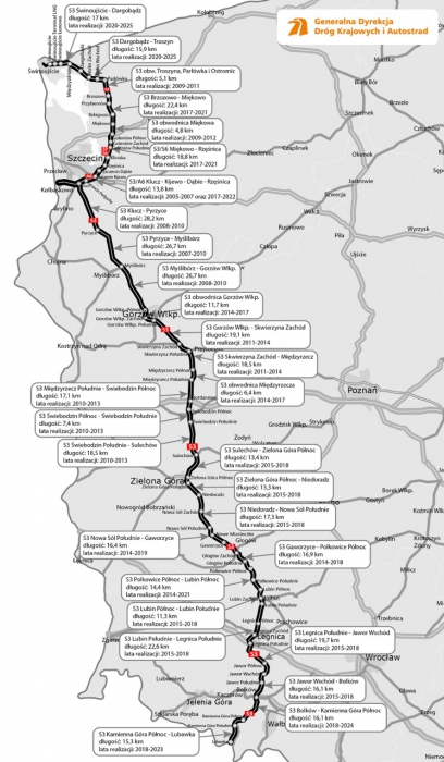 Następnie ruszała budowa odcinków w województwie lubuskim. W latach 2013-2014 kierowcy pojechali odcinkami od Gorzowa Wielkopolskiego do Sulechowa (łącznie 80 km trasy). Dobudowane zostały również drugie jezdnie na obwodnicach Gorzowa Wielkopolskiego i Międzyrzecza. W roku 2018 zostały oddane do ruchu odcinki na południe od Zielonej Góry w kierunku Dolnego Śląska. Równolegle trwała budowa dolnośląskich odcinków S3, większość z nich oddano do ruchu również w 2018 roku. W roku 2021, wraz z zakończeniem odcinka w rejonie Polkowic, S3 spięła ze sobą autostrady A6, A2 i A4. W ubiegłym roku nastąpiła finalizacja budowy południowego odcinka S3, przechodzącego przez obszary górskie do granicy z Czechami. Ukształtowanie terenu spowodowało konieczność budowy dwóch tuneli drogowych, w tym jednego o długości 2,3 km - najdłuższego, pozamiejskiego tunelu w Polsce.
