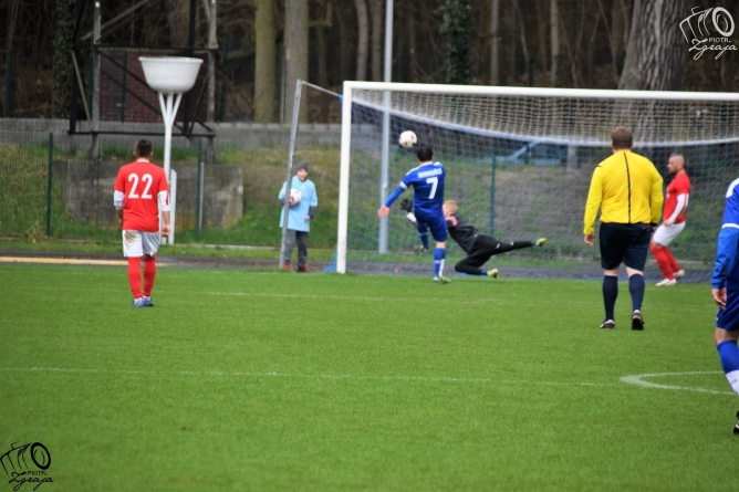 Początek meczu wymarzony. Już w pierwszej minucie Nowak dokładnie obsłużył Staniszewskiego, który głową zdobył prowadzenie. To chyba odebrało gościom chęć do grania, bowiem do 26 minuty praktycznie nie wychodzili oni ze swojej połowy. W tej sytuacji jasnym było, że kolejne gole są kwestią czasu i tak też się stało. Jeśli chodzi o strzał to najefektowniejsza była bramka numer 2, zdobyta przez stojącego tyłem do bramki Skwarę nożycami. Podającym był Trafalski. Trzecia bramka padła po wymianie piłek Nowaka ze Skwarą i strzale tego drugiego, a czwartą zdobył Trafalski po własnej akcji i wymianie piłek ze Skwarą. W 38 minucie kontuzji doznał Staniszewski i został zmieniony przez Bątkowskiego.